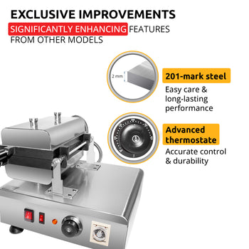 • The upgraded thermostat provides meticulous temperature control, vital for achieving perfectly cooked waffles with each use.