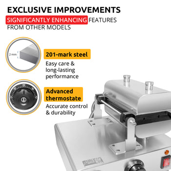 • The upgraded thermostat provides meticulous temperature control, vital for achieving perfectly cooked waffles with each use.