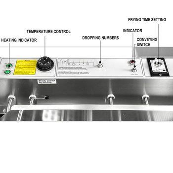 With this machine, control all the steps electrically. Start the machine, set the donut frying timer, and the temperature level. The machine is also equipped with a heating indicator, dripping, and conveying switches.