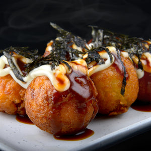 Takoyaki is a ball-shaped Japanese snack made of a wheat flour-based batter and cooked in a special molded iwatani takoyaki grill pan. It is typically filled with minced or diced octopus (tako), tempura scraps (tenkasu), pickled ginger, and green onion. Takoyaki are brushed with takoyaki sauce and mayonnaise and then sprinkled with green laver (aonori) and shavings of dried bonito.
