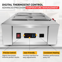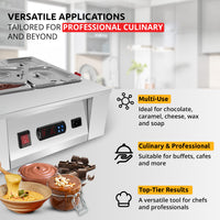 This stainless steel warming station holds up to 10 kg (22 lb) of food across four pots, using a water bath system to gently heat sauces, soups, chocolate, and more without direct exposure to heat. With even steam-based heating, the machine maintains ideal serving temperatures while preserving taste and texture. Built from food-safe stainless steel, it's a durable and low-maintenance addition to any kitchen.