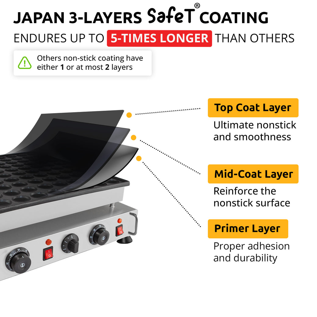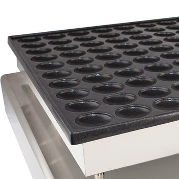 この美しいデザインのポッフェルチェメーカーは、カフェやレストランのオープンキッチンにぴったりです。ステンレススチール製で、ノンスティック加工が施されているため、操作が簡単で、常に清潔に保ち、より長くお楽しみいただけます。焼き型は熱伝導率の高い高級アルミニウム製です。調節可能なコントロールノブで温度を調節し、美味しくふわふわのミニパンケーキを焼き上げましょう。