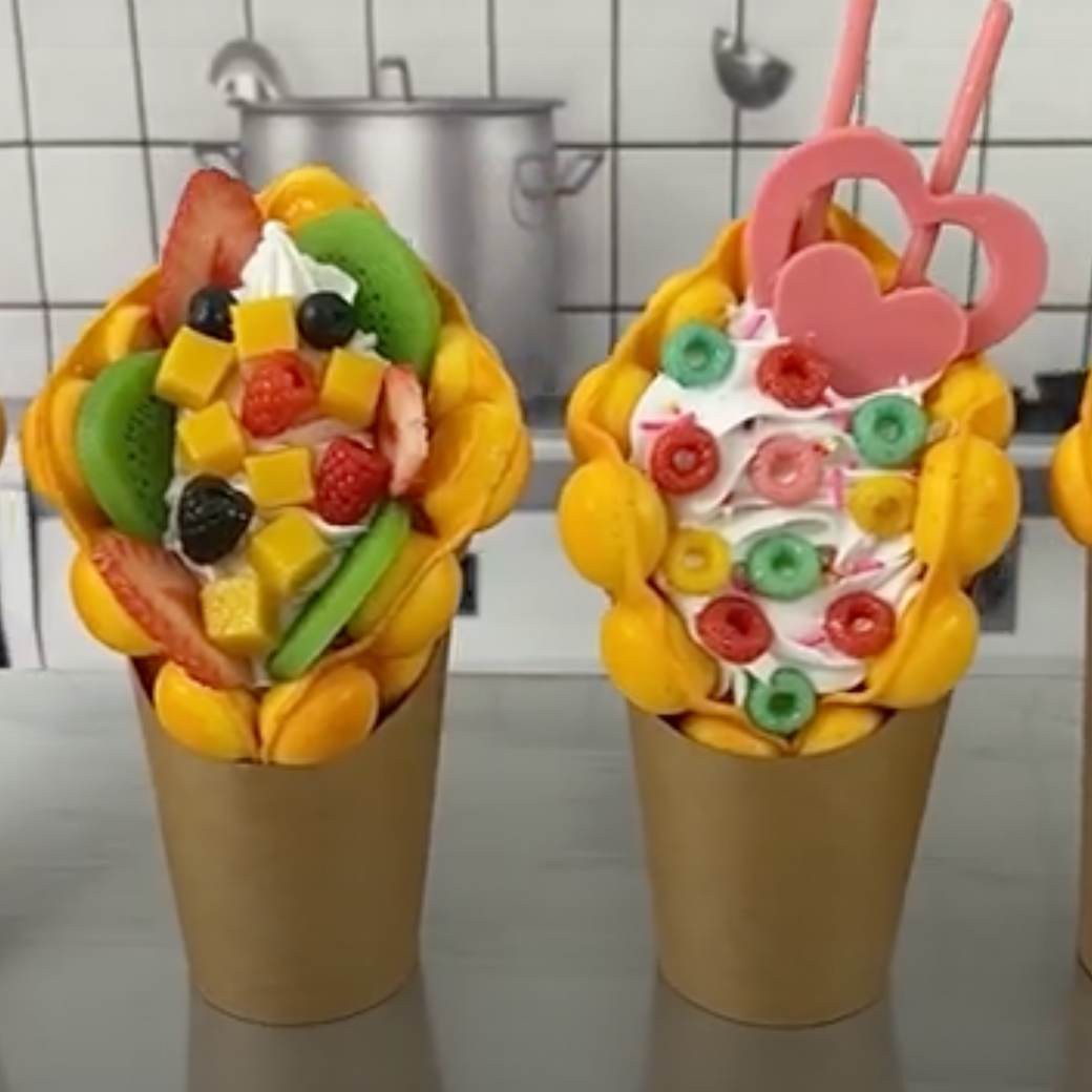 バブルワッフルには、アイスクリーム、チョコレート、フルーツなど、さまざまなものを詰めることができます。詰める具材の数は無限なので、新しいものを試したい場合でも、お気に入りのワッフルを持ち帰りたい場合でも、お客様はまた来店するでしょう。