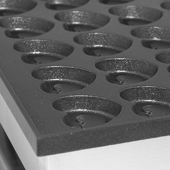 このマシンは、数分でたくさんのミニパンケーキを作れるように設計されており、お客様を待たせることなく、この軽食を素早く提供できます。ポッフェルチェは、お皿に盛り付けてその場で食べることも、トレイに入れて持ち帰ることもできます。このマシンは、ハート型のポッフェルチェを25枚同時に焼くことができます。